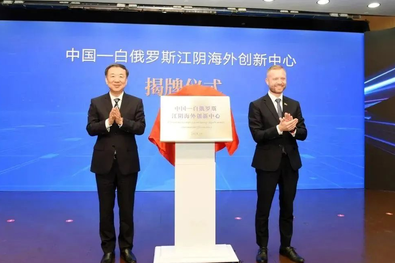 2024年10月18日,中国—白俄罗斯(江阴)海外创新中心在“2024江阴国家高新区开放创新合作交流会”上正式揭牌。无锡市委常委、江阴市委书记许峰,白俄罗斯驻华大使馆科技参赞里亚布采夫•叶夫根尼共同为江阴海外创新中心揭牌。