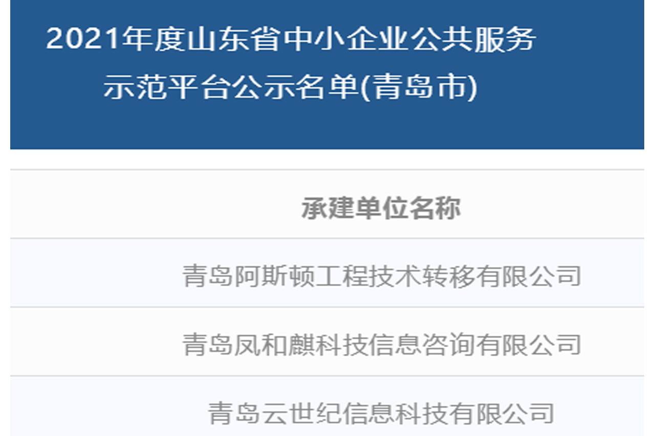 2021年7月2日,山东省工信厅发布《2021年度山东省中小企业公共服务示范平台名单公示》,经过前期评审,全省共有88家平台拟获认定,其中17家来自青岛市,青岛阿斯顿工程技术转移有限公司位列其中。