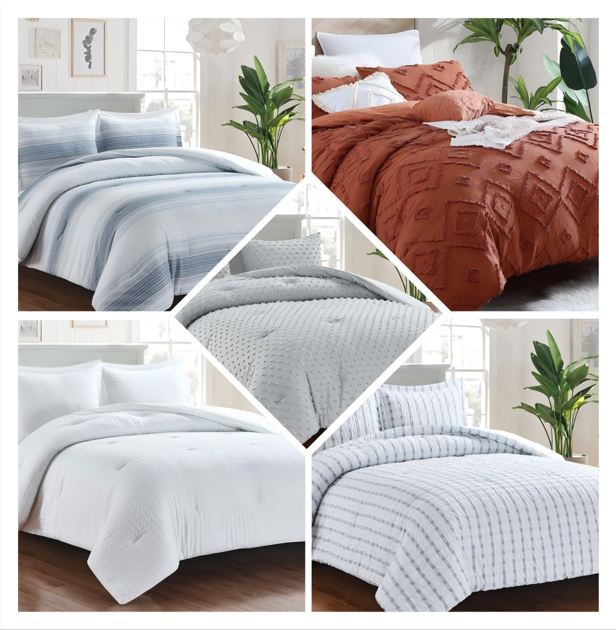 青岛瑞信家用纺织有限公司/内外贸专区。 床上用品 绗缝被:具有精致的绗缝工艺,兼具保暖与装饰性,款式多样,可搭配不同的卧室风格。 床单套:包括床单以及配套的枕套,有多种尺寸、材质和图案可供选择,如纯棉、亚麻等材质,满足不同消费者的需求。 被套:设计风格多样,可与床单套、枕套等搭配使用,方便更换清洗,保护被芯的同时提升床品的整体美观度。 枕套:有不同的尺寸和款式,如标准枕套、方形抱枕套等,可与床上其他用品相协调,起到装饰和保护枕头的作用。
