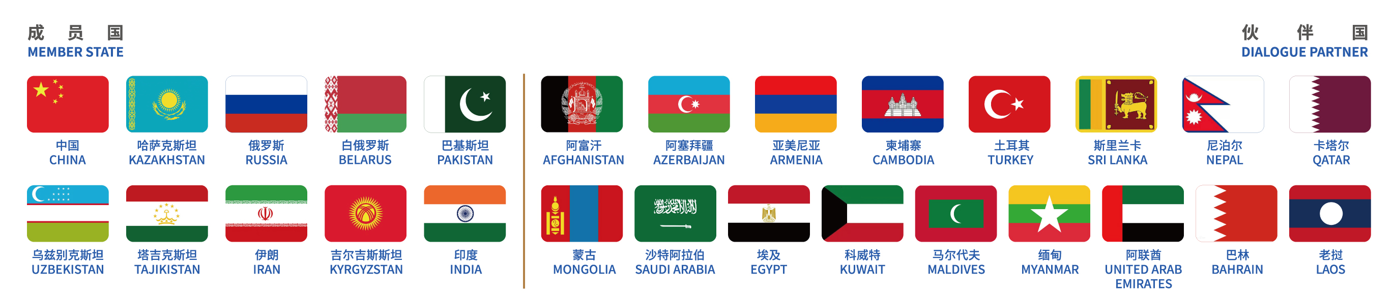 上海合作组织简称上合组织,于2001年6月15日在中国上海宣布成立,是永久性政府间国际组织。 是人口最多(占世界人口数量超过45%)、地域最广(占欧亚总面积超过60%)、潜力巨大(GDP占全球超过22%)的区域多边综合性组织,是中国“一带一路”国家倡议的关键之一。