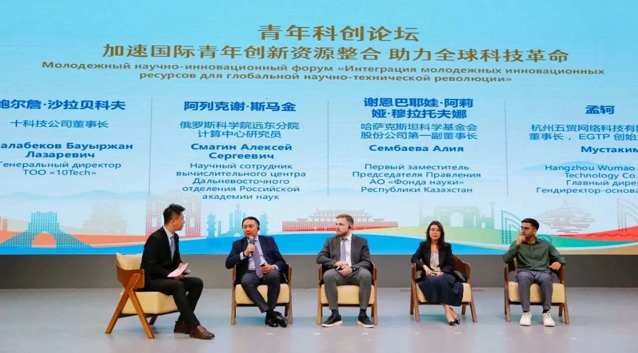 青年科创论坛环节,哈萨克斯坦10Tech公司董事长鲍尔詹·沙拉贝科夫、俄罗斯国家科学院远东分院计算中心研究员阿列克谢·斯马金、哈萨克斯坦科学基金会股份公司第一副董事长谢恩巴耶娃·阿莉娅,杭州五贸网络科技有限公司董事长、EGTP创始人CEO孟轲就国际青年创新资源整合这一议题,探讨了联合人才培养、青年创业孵化等内容。