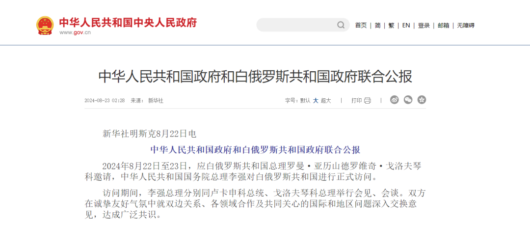 2024年8月22日至23日,应白俄罗斯共和国总理罗曼·亚历山德罗维奇·戈洛夫琴科邀请,中华人民共和国国务院总理李强对白俄罗斯共和国进行正式访问。