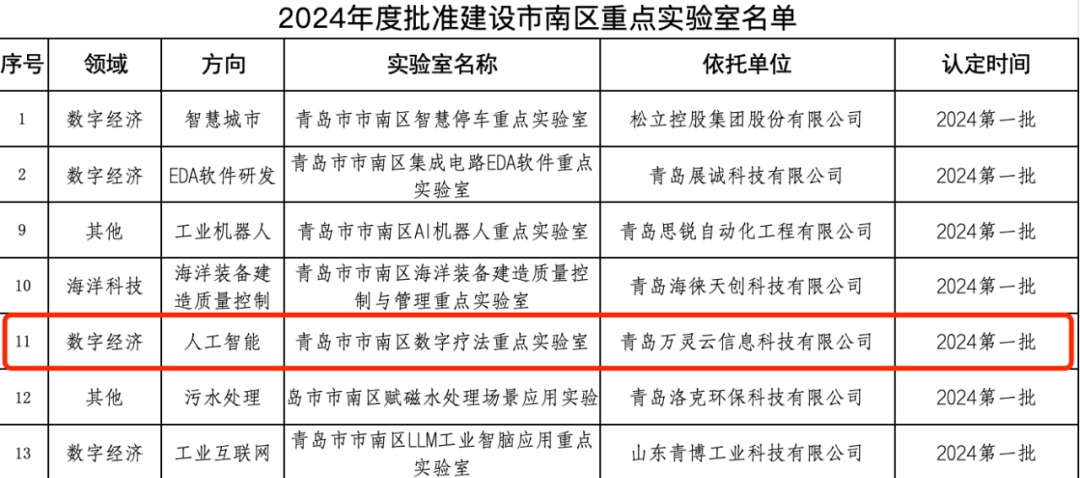 中心孵化企业青岛万灵云获选2024年市南区数字疗法重点实验室